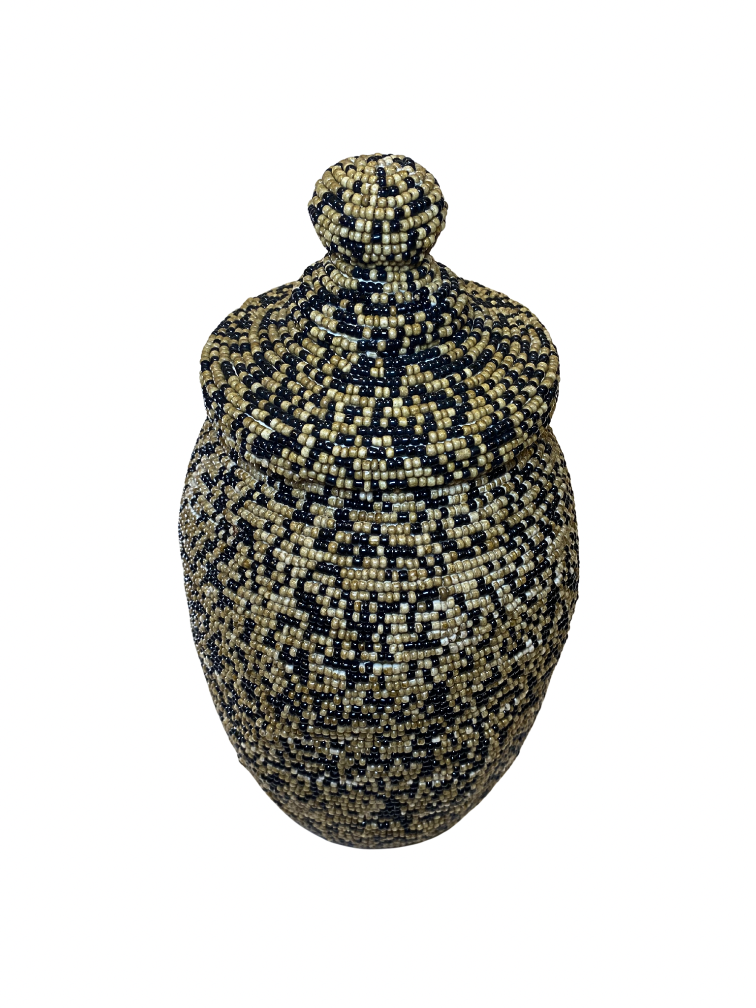 This is a small, decorative jar with a lid, completely covered in an intricate pattern of tiny beads. Its shape is slightly ovoid or egg-like, and it has a rounded lid with a knob on top