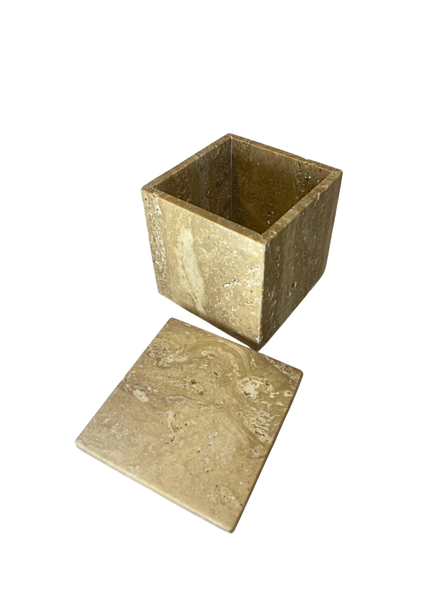 This elegant, minimalist storage box is handcrafted from natural Travertine stone. Its simple square form and matching removable lid make it a versatile piece for any surface.