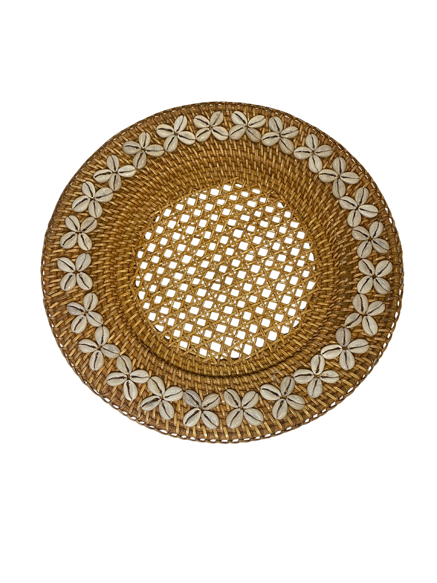This unique rattan placemat is decorated with a beautiful border of natural cowrie shells, adding a touch of coastal charm to your table setting.