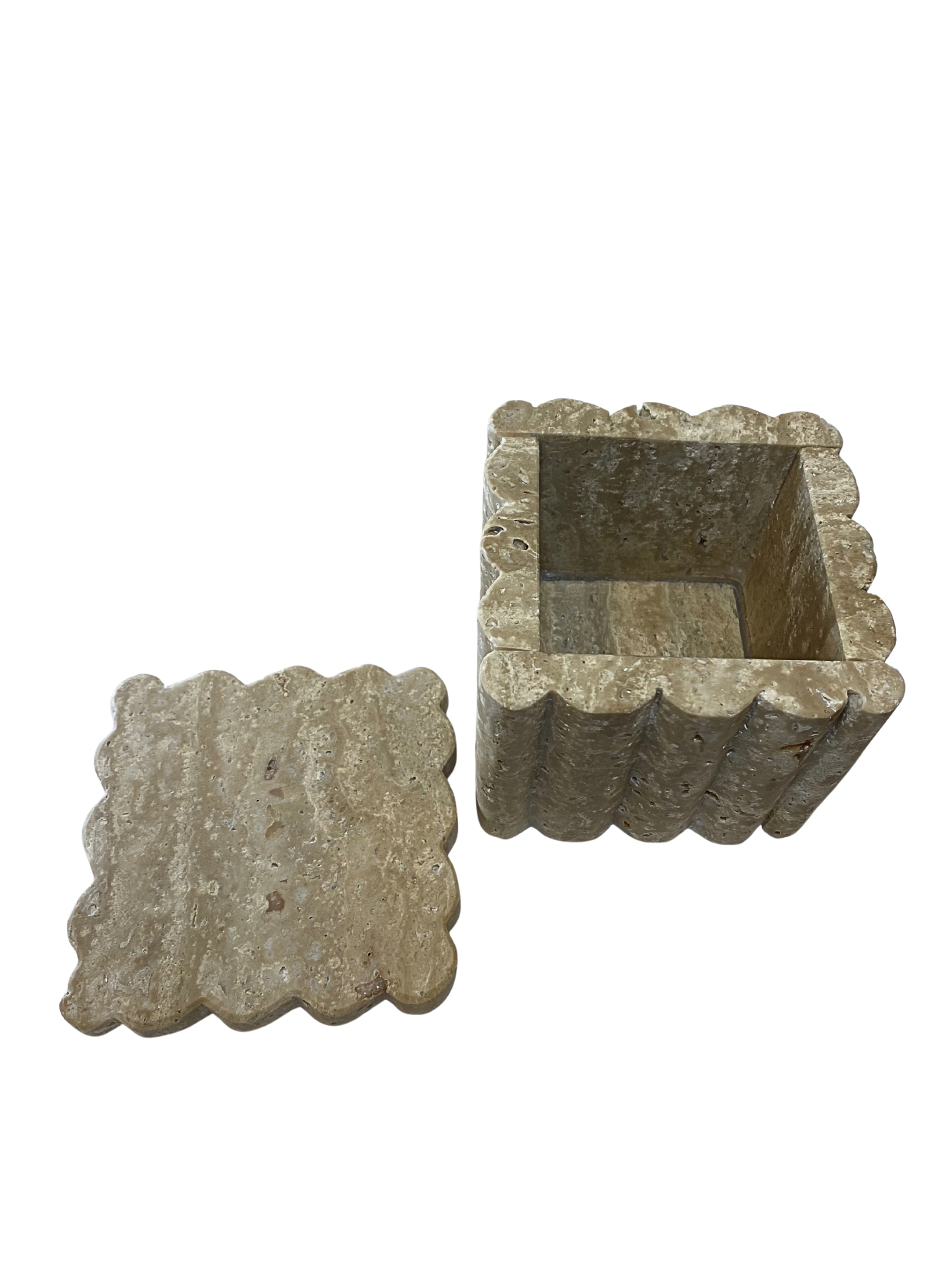 A beautiful, naturally textured travertine box featuring a distinctive scalloped, wave-like body and lid. Perfect for storing jewelry, trinkets, or as a sophisticated decorative accent.