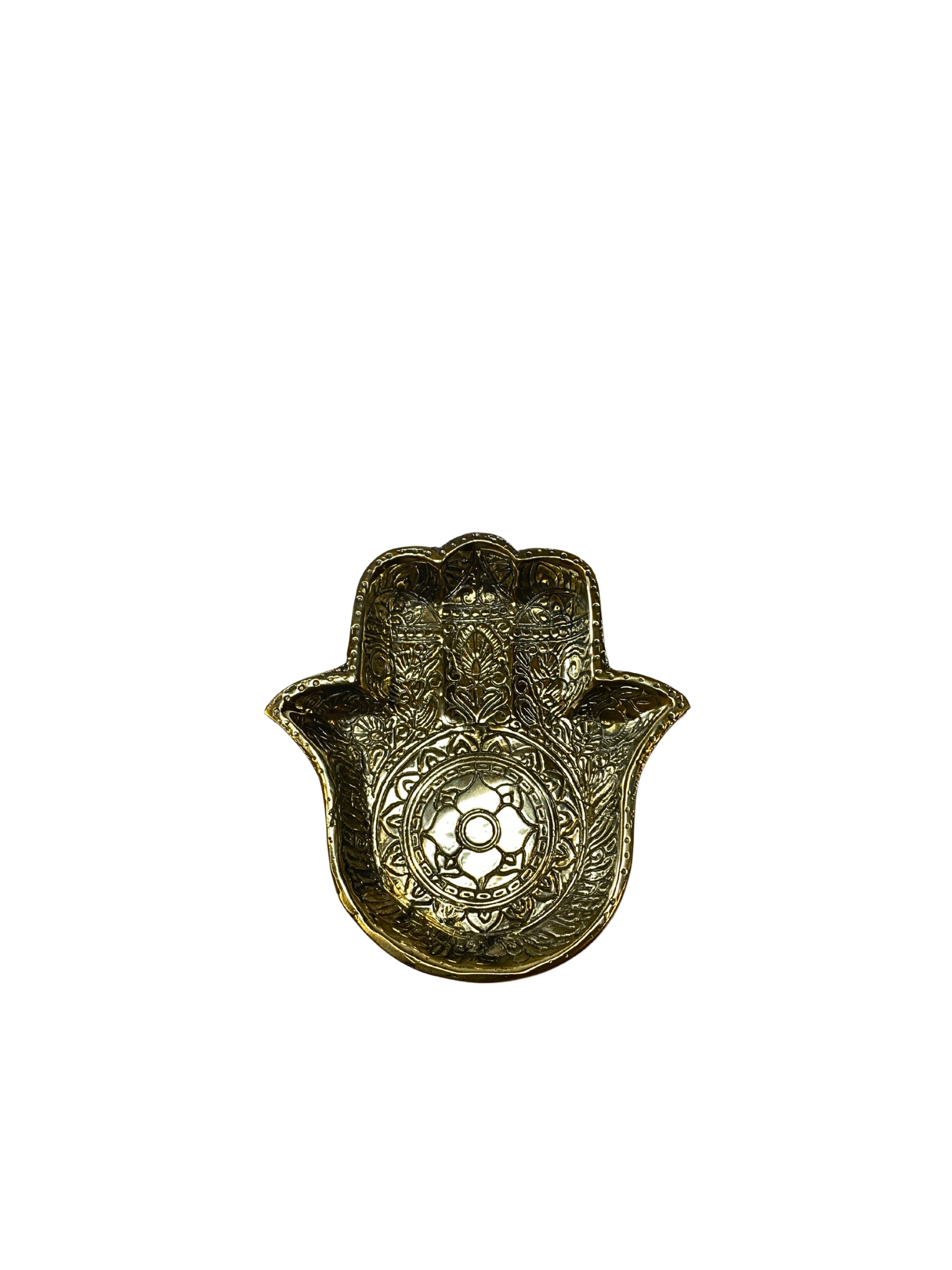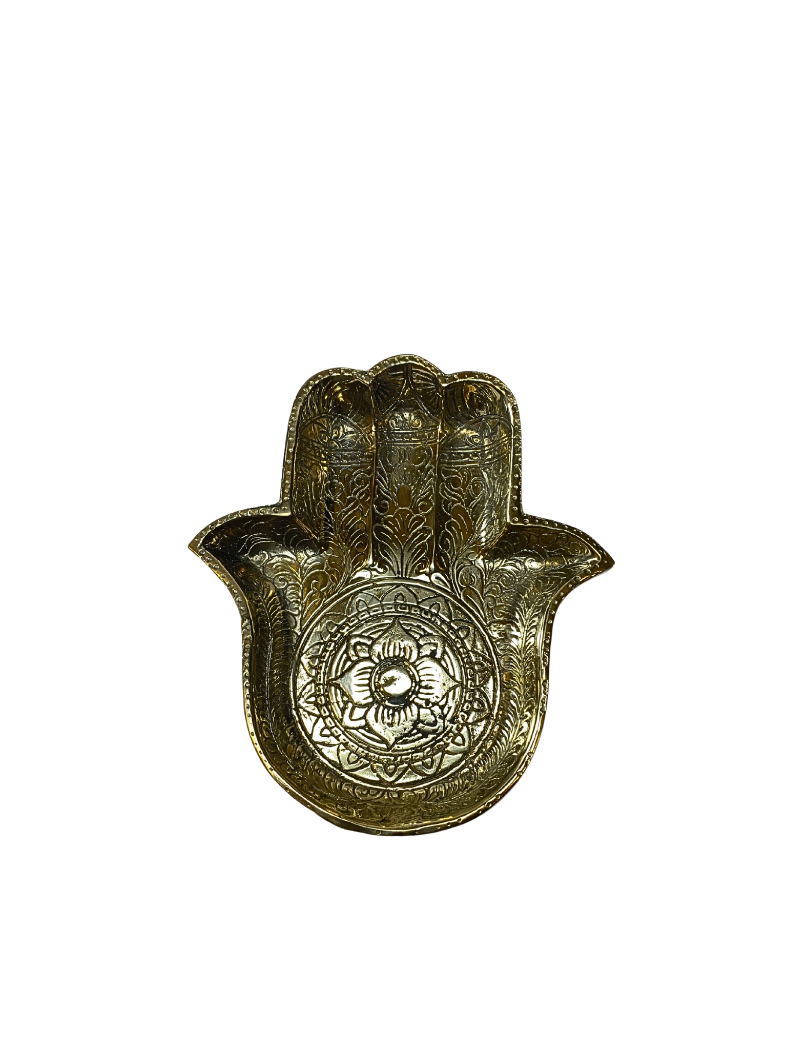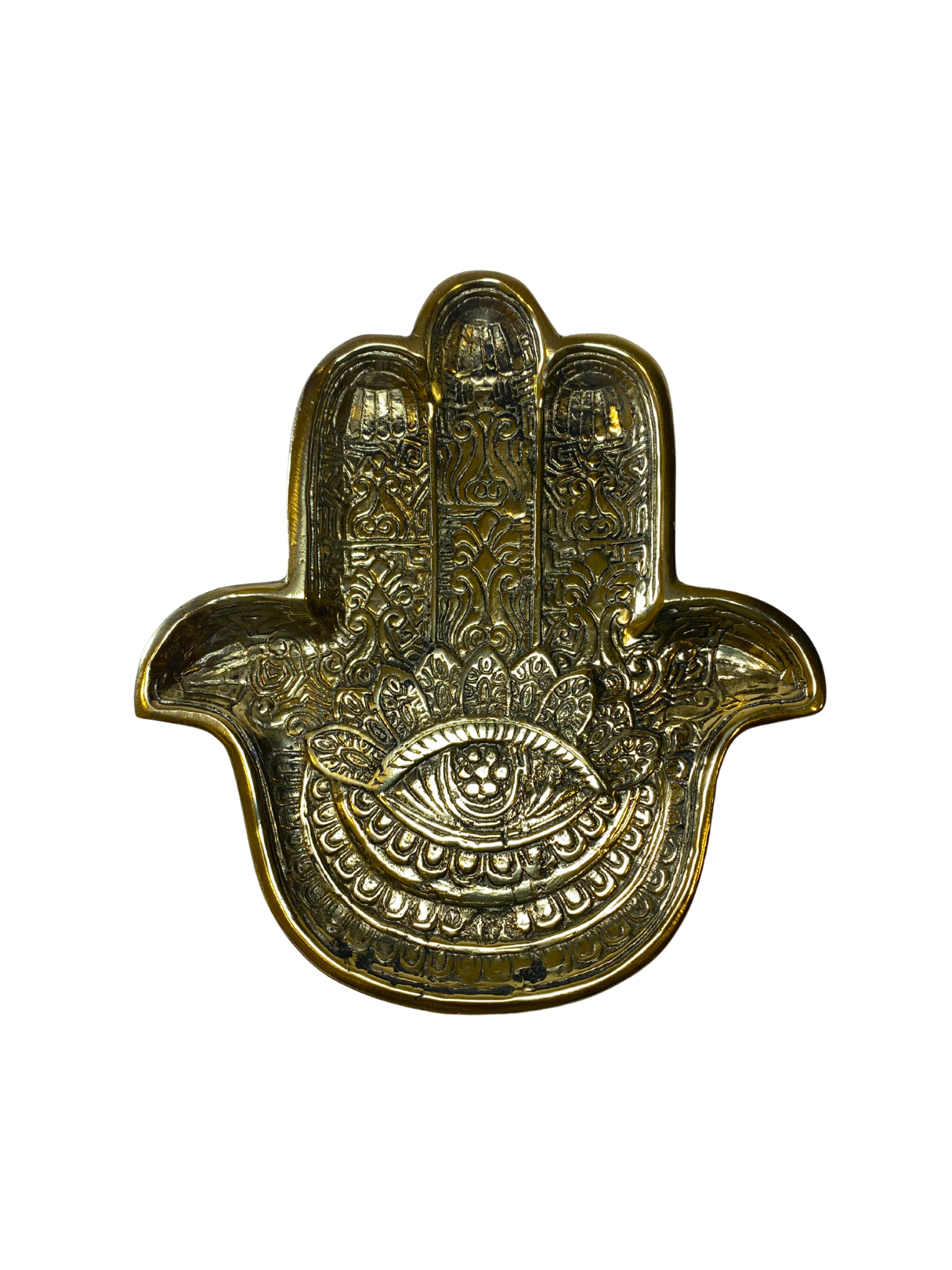 Elevate your space with this intricately etched, gold-tone Hamsa dish. Use this symbolic hand to protect and organize small treasures like rings and earrings on your nightstand or dresser.